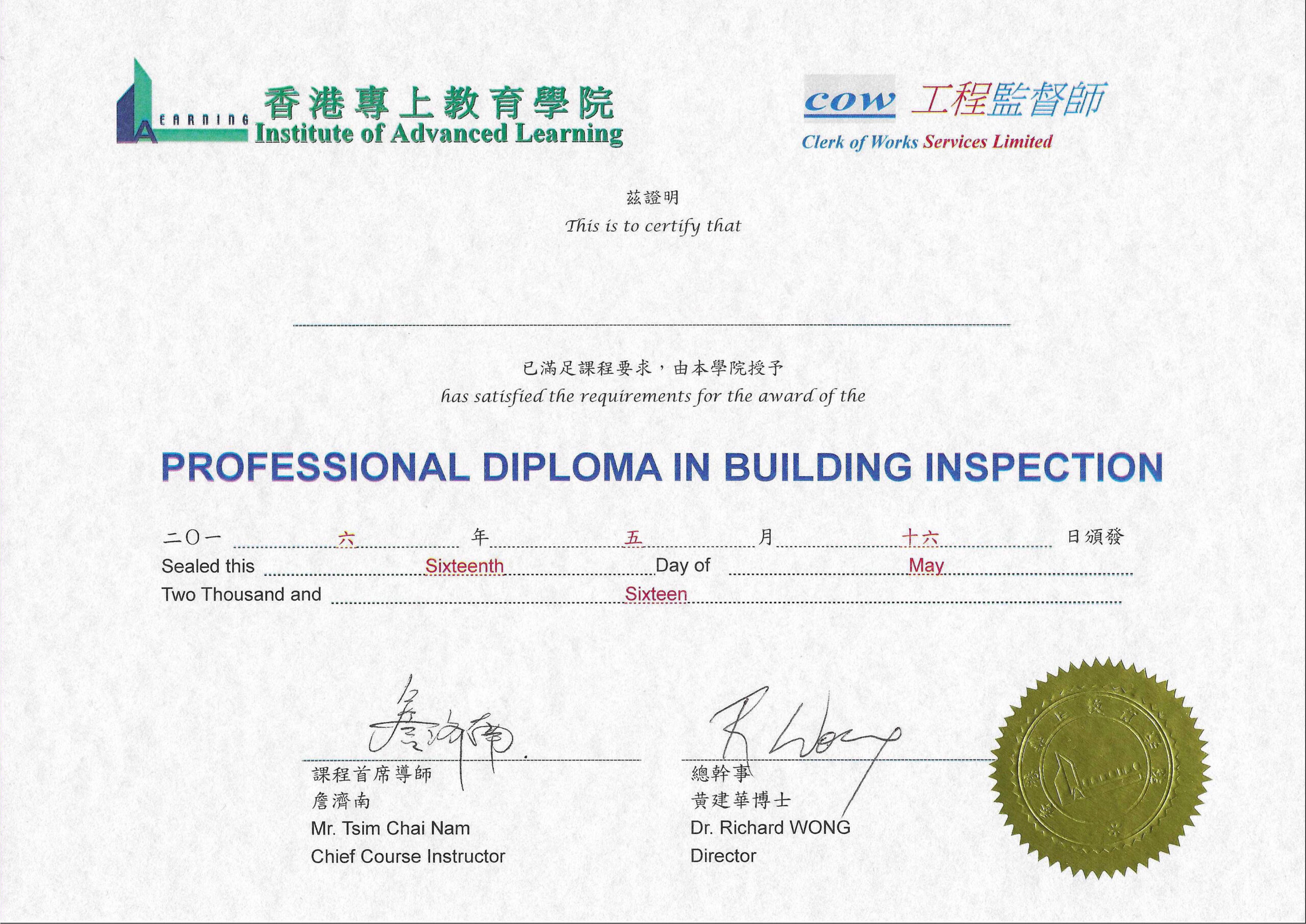 香港專業驗樓學會會員證書 Certificate of Membership – Hong Kong Professional Building Inspection Academy Limited